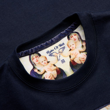 The Rules Of Faith oversized T-shirt is crafted from 100% cotton yarn, offering a soft and breathable feel. Made in a luxury 270gm weight, it ensures durability without sacrificing comfort. The design features our soft velvet applique with print, adding a luxurious texture, while branded embroidery on the sleeve elevates its style. RoF branded eyelets and a printed back neck yoke add distinctive, thoughtful detail.